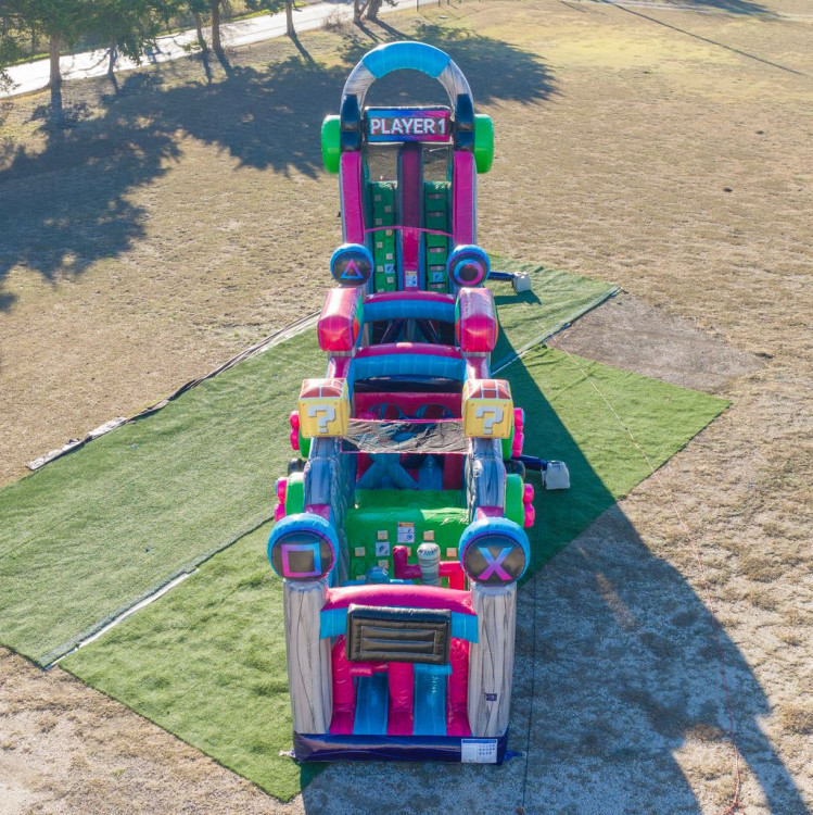Bring gaming energy to the backyard with this action-packed inflatable obstacle course designed for competitive fun. Built for groups, it combines climbing elements, tunnels, and slide sections into a continuous course that challenges speed, agility, and coordination. Players race head-to-head or solo runs through a sequence of cushioned barriers and crawl spaces, then sprint to the finish—perfect for birthday parties, school events, or community gatherings where kids and teens want fast-paced, interactive entertainment. Durable inflatable walls and soft landing zones keep play safe, while the compact linear layout allows straightforward setup on grass or other flat surfaces. High-energy, easy to supervise, and sure to spark friendly rivalry, the Gamer Obstacle Course turns any event into a tournament of skill.