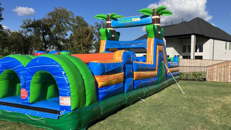 Dash through a jungle-themed obstacle course with dual racing lanes, crawl-through tunnels, pop-up hurdles, a climb wall, and a fast slide finish. Easy to set up for parties, school events, or team-building, it handles kids, teens, and adults and works best in a long, open space for side-by-side races.
