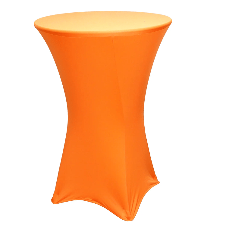 • Orange cocktail spandex table coverA sleek, form-fitting spandex tablecloth that stretches smoothly over standard tables to create a modern, wrinkle‑free look. Made from flexible, durable fabric, it hugs corners and legs for a tailored, polished presentation—perfect for trade shows, receptions, and stylish events where a clean, contemporary table surface is desired. Easy to slip on and remove, it stays put during use and wipes clean for quick turnover between rentals.