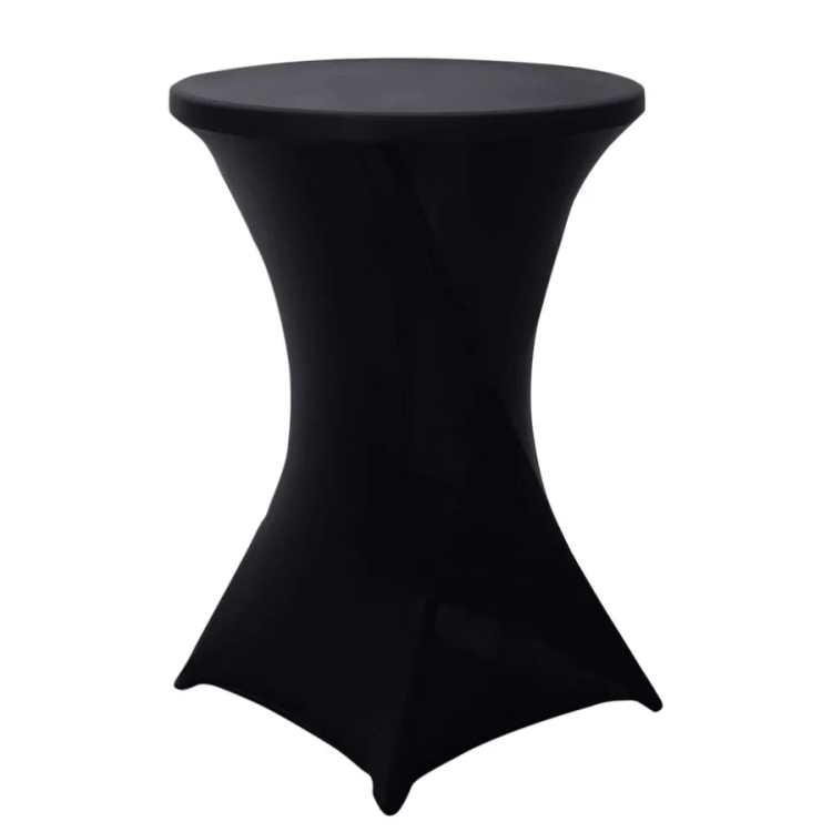 • black cocktail table coverA sleek black cocktail table cover that slips over standard round high-top tables to create a clean, polished look for any event. Made to fit snugly, it hides legs and undersides for a seamless silhouette, instantly elevating cocktail hours, receptions, trade shows, and corporate gatherings. The versatile black color complements any décor and pairs easily with centerpieces, linens, or branded accents. Durable and easy to set up and remove, this cover helps transform ordinary tables into a refined focal point while keeping the overall presentation neat and professional.