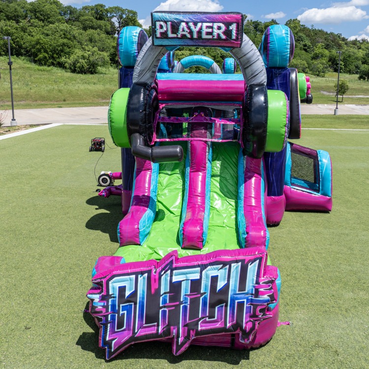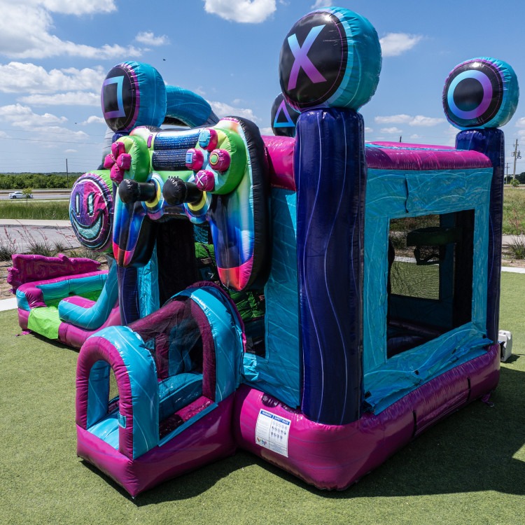 Level up your next party or event with our Game On Combo Bounce House! This bright, colorful unit is a gamer’s dream come true—complete with a giant game controller design, climbing wall, slide, and spacious bouncing area.