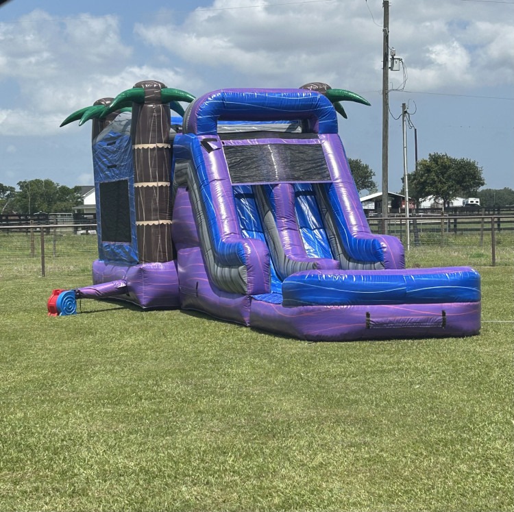 A bright, island themed combo bounce house that pairs a roomy bounce area with an attached slide, all in a bold tropical marble pattern. Great for backyards, school events, and block parties, and can be used dry—or with water if allowed—for nonstop fun.